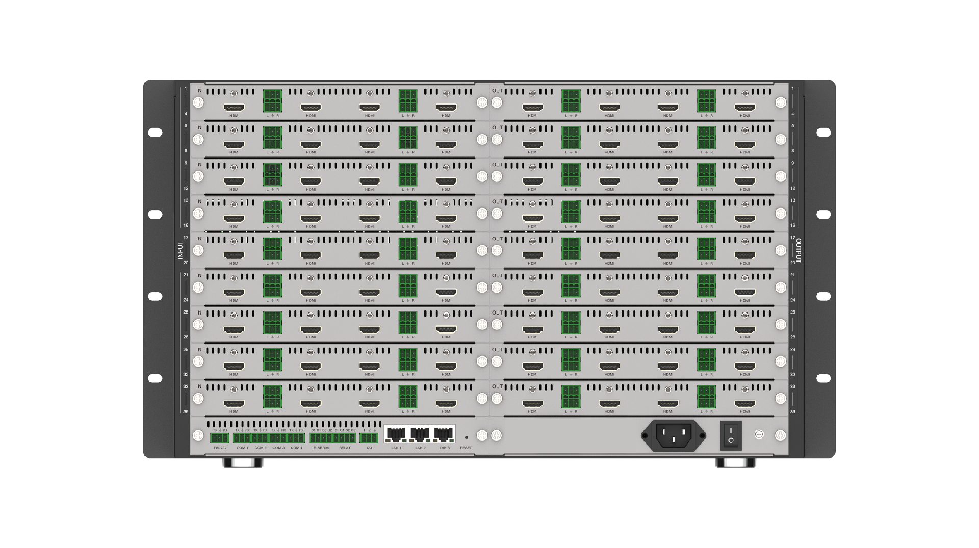 本款高清无缝混合插卡矩阵是一款支持各种音视频信号切换与分配、集成网络中控、视频墙功能的专业矩阵一体机。最多支持36路信号输入和36路信号输出。音视频矩阵采用纯硬件高速矩阵切换芯片,集成度高、系统稳定、信号无压缩、无损耗、无延时,先进的全数字信号处理技术可保证信号无失真处理,将最优质的画面还原到显示终端