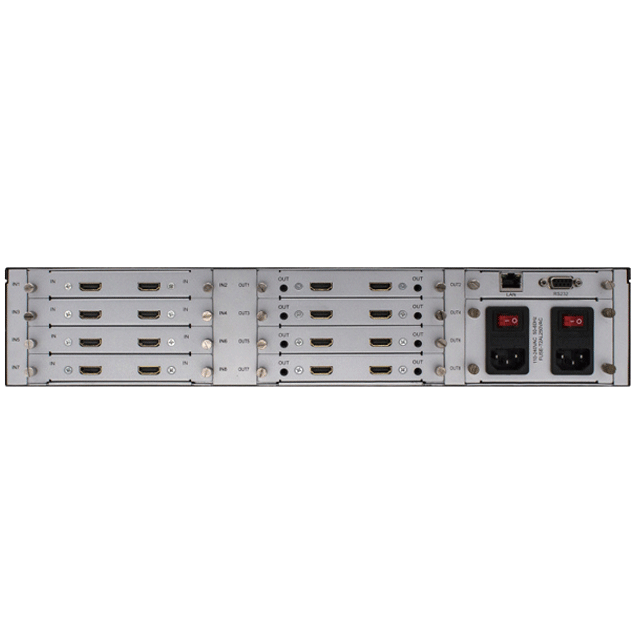 格式混插无缝切换矩阵是一款高性能的高清视频信号交换设备,最多可支持8路信号输入,8路信号输出,采用后插板式结构。该产品支持多种视频格式信号输入输出,可以用于多个高清数字视频信号及模拟视频信号的输入、输出交换,任意一路信号的输出可以选择任意一路信号源而不会干扰其它输出,图像高保真输出。 多格式矩阵采用插板式结构,安装灵活方便,目前支持光纤,HDBaseT,HDMI,DVI,3G/HD/SD-SDI,VGA,YPbPr,CVBS等信号输入及输出。同时具备Ethernet及RS-232通讯接口,通过专用的控制软件控制矩阵信号的切换,监测矩阵的工作状态,设置信号分辨率等。